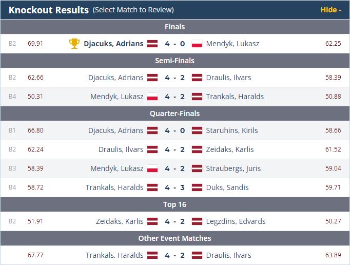Visa turnīra informācija, spēļu protokoli un statistikas pieejamas Dartconnect portālā.