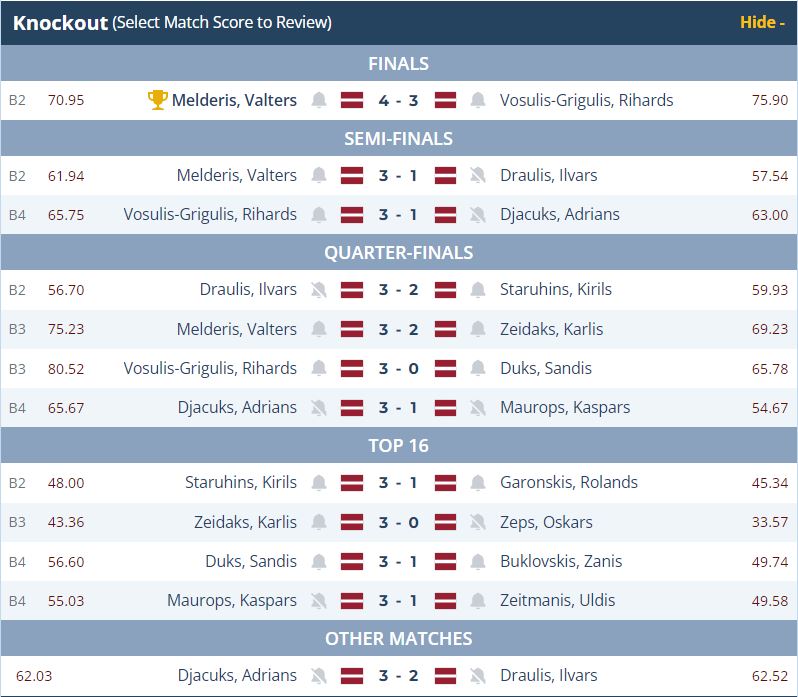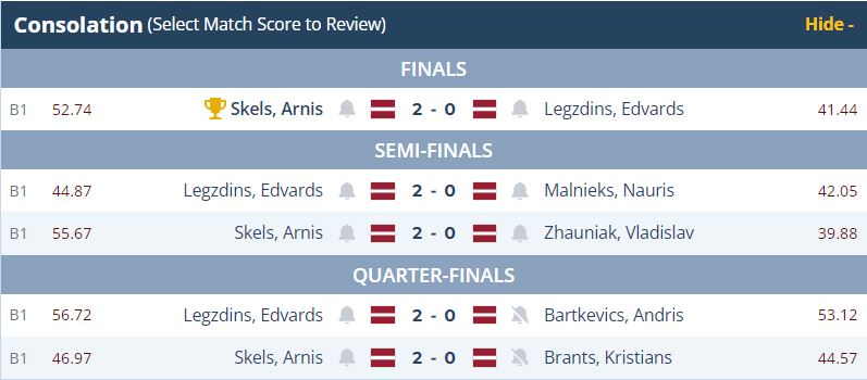 Savukārt gandarījuma turnīrā uzvaru izcīnīja Arnis Šķēls finālā ar 2:0 pārspējot Edvardu Legzdiņu.