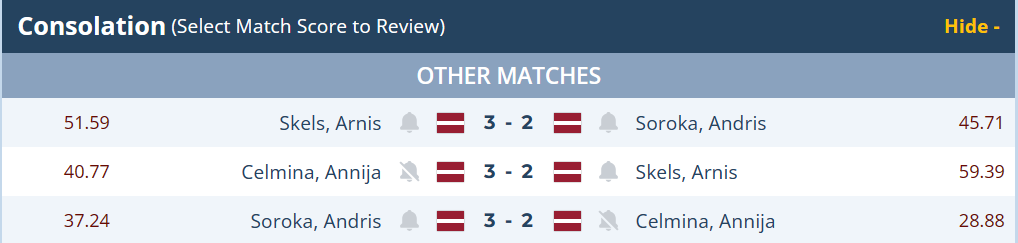 Šoreiz gandarījuma turnīrs tika izspēlēts kā 3 cilvēku grupa. Pārsteidzoši, bet visas spēles noslēdzās ar identisku rezultātu 3:2, katram no 3 spēlētājiem Annijai, Andrim un Arnim izcīnot pa vienai uzvarai.