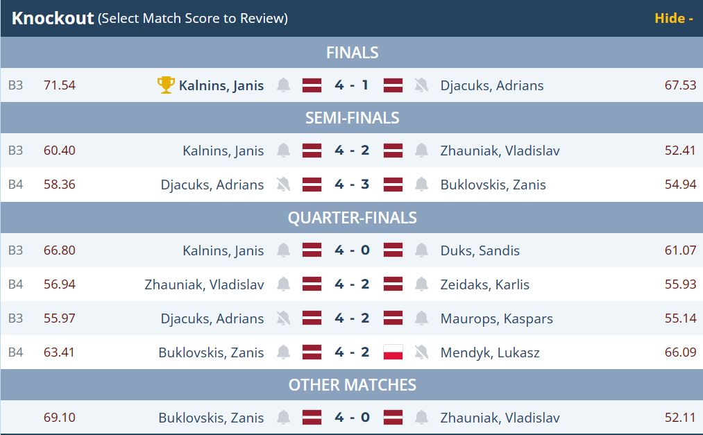Fināls pret Adrianu. Protokols nemelo, jānis labāk turās sektoru robežās, tikmēr Adrianam iet kā pa amerikāņu kalniņiem. Ja iet kā pa kalniņiiem, tad jāpiekāpjas Kalniņam. Šoreiz uzvarēja stabilitāte.