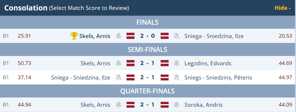 Arnis Šķels (25,91) 2:0 Ilze Sniega – Sniedziņa (20,53)