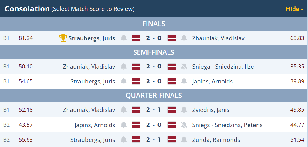 Par spēcīgāko gandarījuma turnīrā izrādījās Juris Straubergs, kurš finālā, lai gan tikai līdz diviem legiem, bet uzmeta iespaidīgu 81,24 vidējo punktu rādītāju, pieveicot Vladislav Zhauniak.