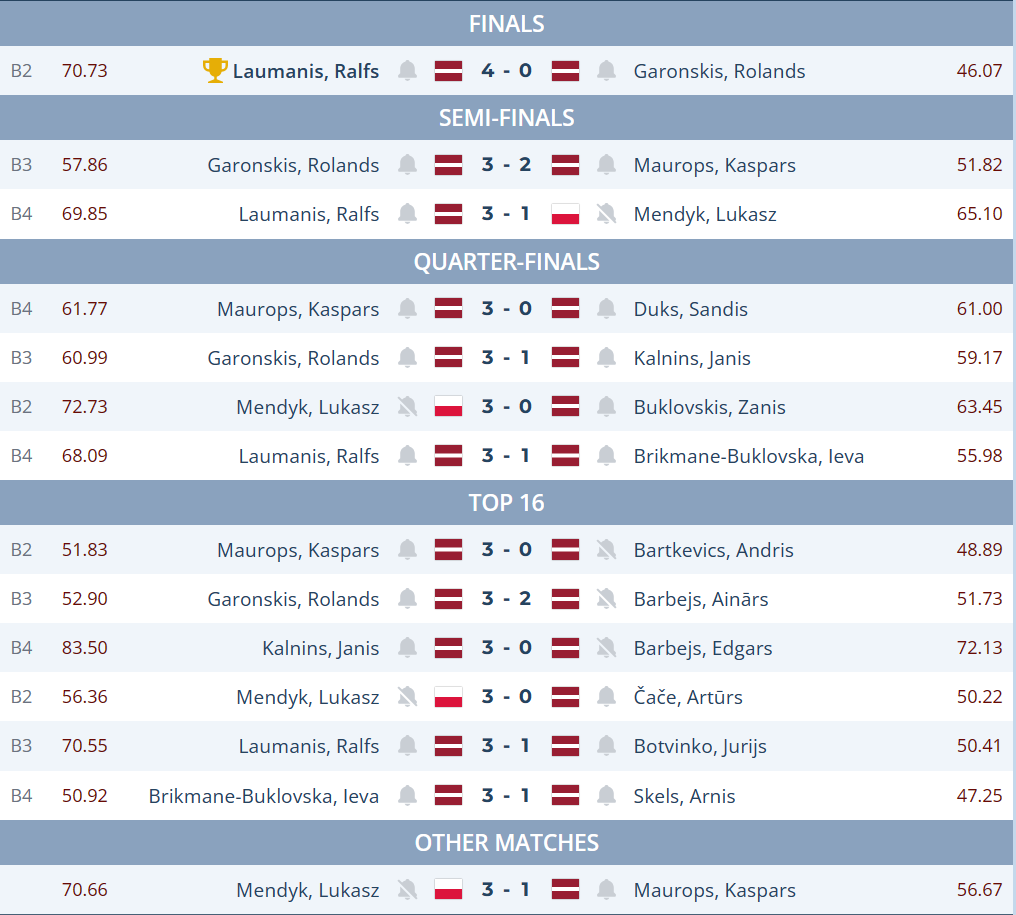 Ralfs Laumanis (70,73) 4:0 Rolands Garonskis (46,07)