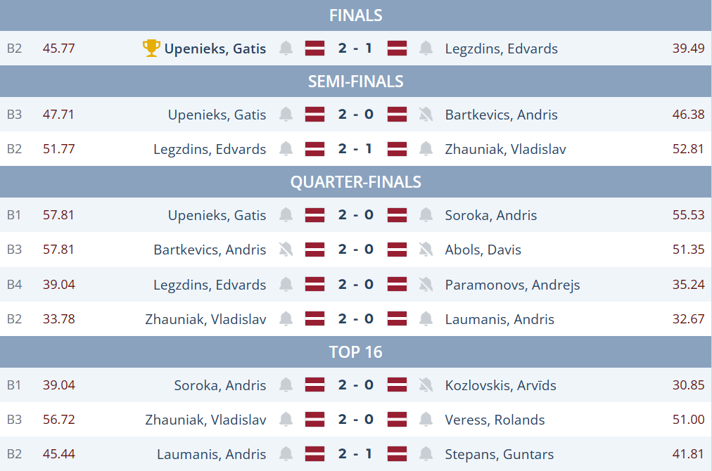 Trešās vietas spēle: Lauri Karavics (63,28) 4:0 Kaspars Maurops (50,16)