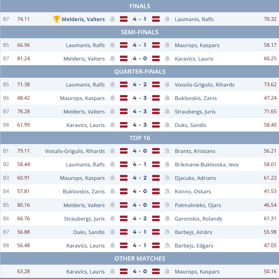 Turnīra fināls: Valters Melderis (74,11) 4:1 Ralfs Laumanis (70,32)