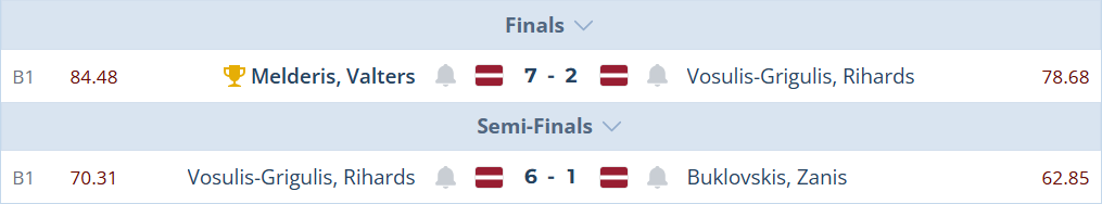 Valters Melderis (84,48) 7:2 Rihards Vosulis – Grigulis (78,68)