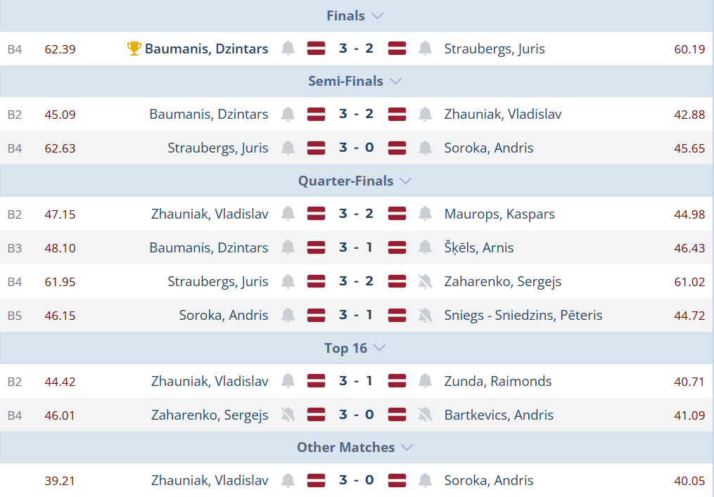 Dzintars Baumanis (45,09) 3:2 Vladislav Zhauniak (42,88)