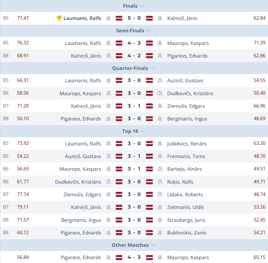 Ralfs Laumanis (76,32) 4:3 Kaspars Maurops (71,39)