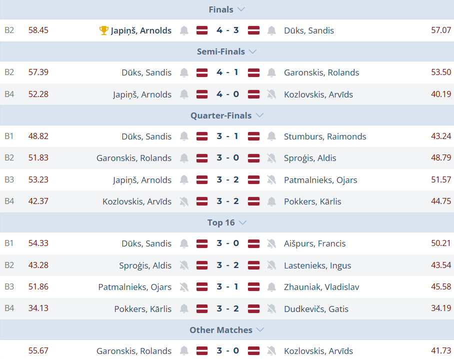 Rolands Garonskis (55,67) 3:0 Arvīds Kozlovskis (42,73)