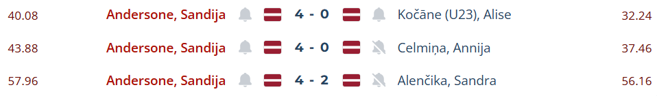 Top 16 cīkstēšanās ar Aretu Kovaļevsku. Pirmie divi legi pārliecinoši Sandijai, tā arī nepalaižot pretinieci uzmest pa dubultajiem. Trešo legu savā labā noslēdz pretiniece. Turpmāka atspēlēšanās gan izpaliek. Spēles ceturtajā un piektajā legā Sandija atkal izteikti pārāka un noformē uzvaru ar rezultātu 4:1. Spēles protokols.