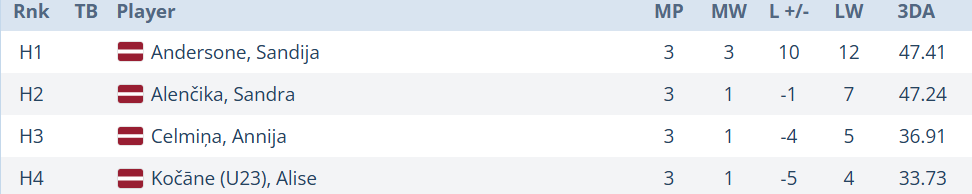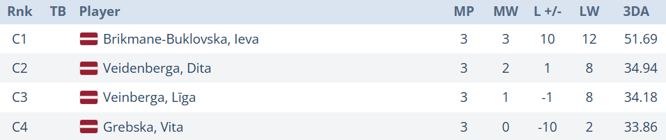 Ieva “Ezis” Brikmane – Buklovska grupā spēlē pārliecinoši, zaudējot vien 2 legus trīs spēļu ietvaros. Likumsakarīga pirmā vieta grupā, un rikšiem uz izslēgšanas spēlēm.
