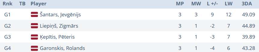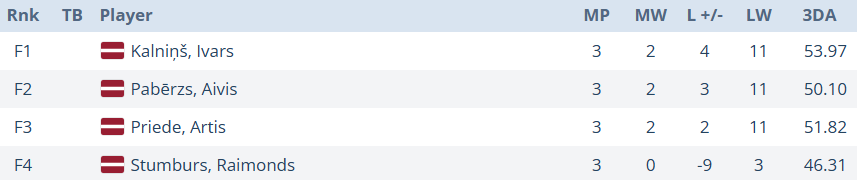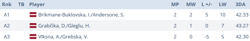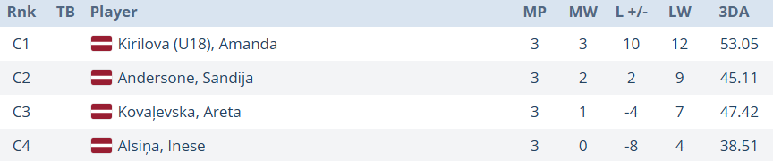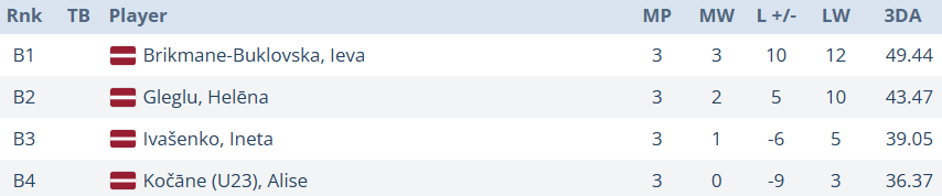 Ieva “Ezis” Brikmane – Buklovska grupā pārliecinoši tiek galā ar savām pretiniecēm, 3 spēļu gaitā zaudējot tikai 2 legus. Uz izslēgšanas spēlēm kā grupas uzvarētāja.