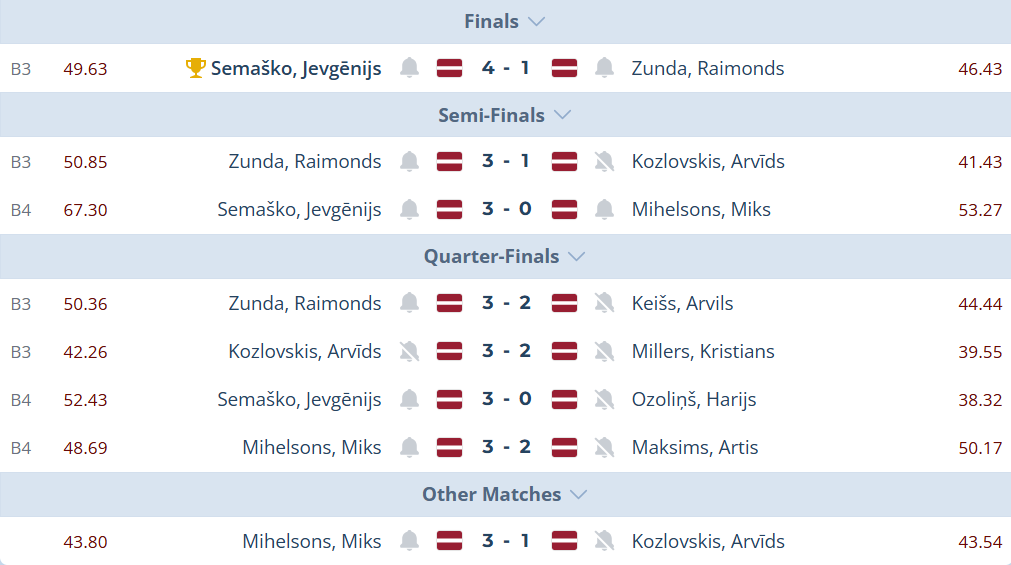 Raimonds Zunda (50,84) 3:1 Arvīds Kozlovskis (41,43)