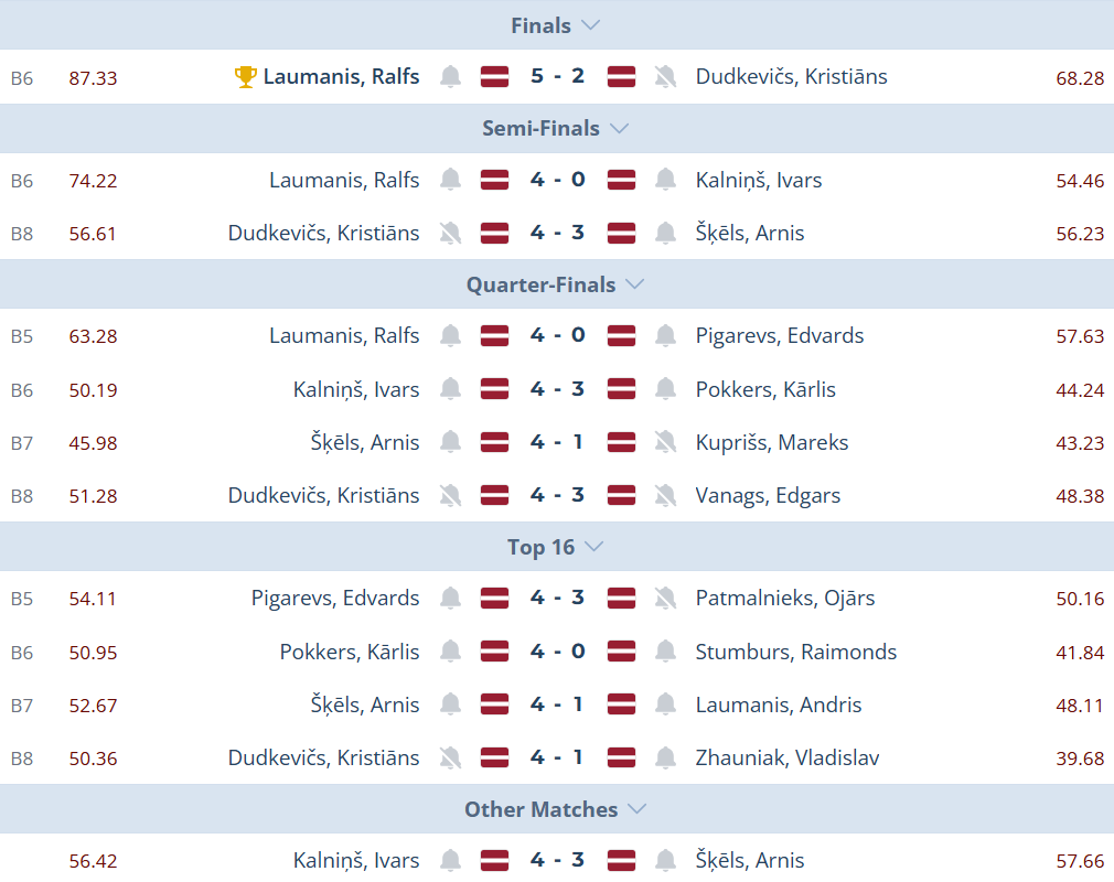 Ralfs Laumanis (87,33) 5:2 Kristiāns Dudkevičs (68,28)