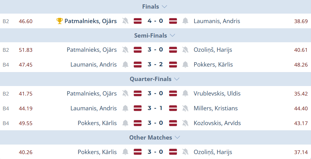 Ojārs Patmalnieks (46,60) 4:0 Andris Laumanis (38,69)