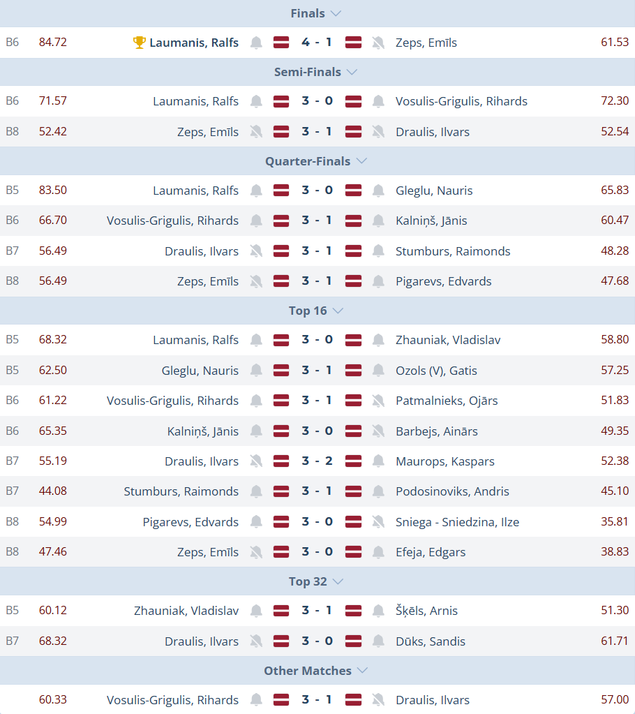 Rihards Vosulis – Grigulis (60,33) 3:1 Ilvars Draulis (57,00)