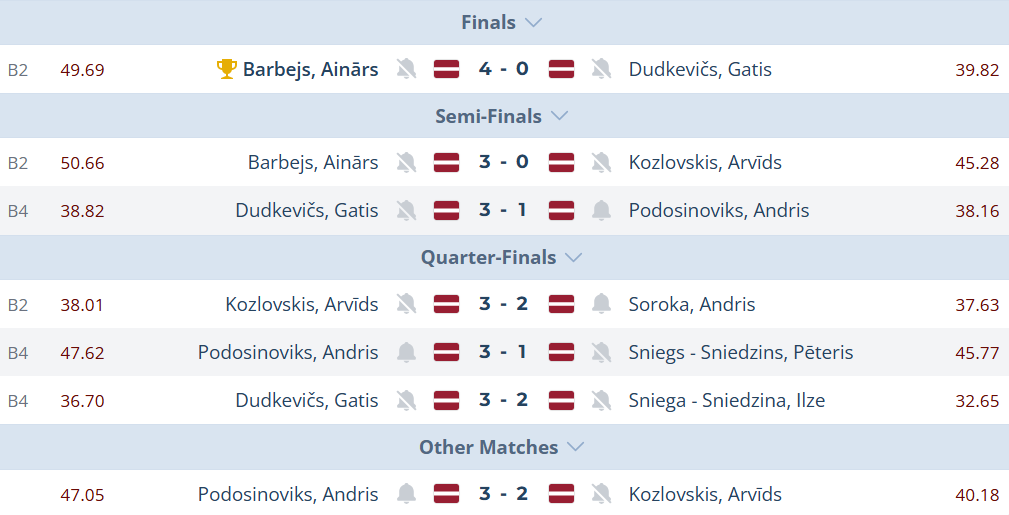 Ainārs Barbejs (49,69) 4:0 Gatis Dudkevičs (39,82)