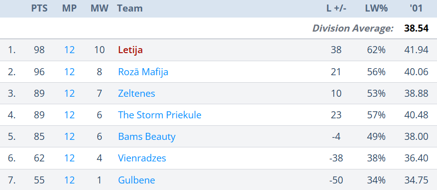 Pirmajā sabraukumā meitenes zaudēja komandai “Rozā mafija”, bet nu izdevās revanšs. Arī šoreiz gan gluži bez zaudējumiem neiztika,- nācās piekāpties komandai “The Storm Priekule”. Toties visās pārējās spēlēs izcīnīti panākumi! Priecē fakts, ka sīvi uzvarētajās cīņās mūsu dāmu pārstāvētajai komandai nenotrīcēja roka un izdevās gūt panākumus saspringtās spēļu galotnēs. Kopvērtējumā ar 10 uzvarām 12 cīņās mūsu dāmu pārstāvētā komanda izcīna uzvaru regulārajā sezonā! Novēlam tikpat sekmīgu sniegumu arī finālturnīrā un Baltijas kausā!