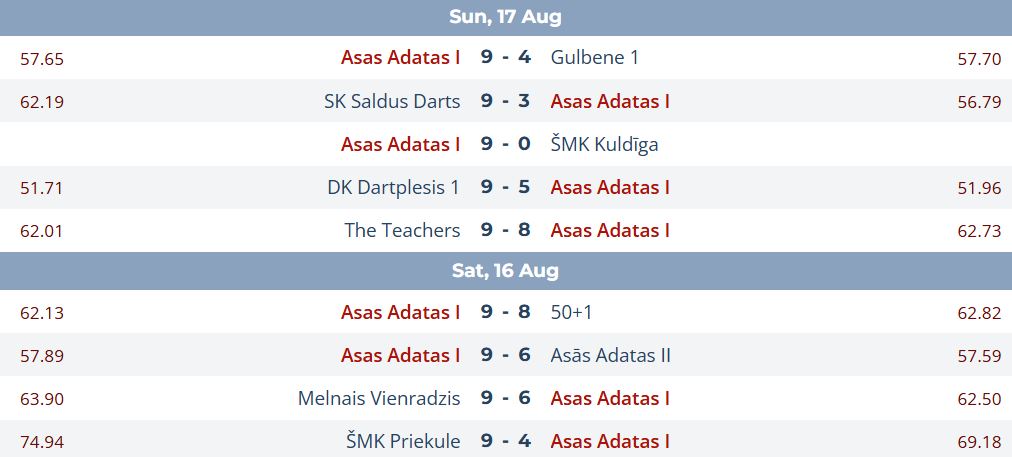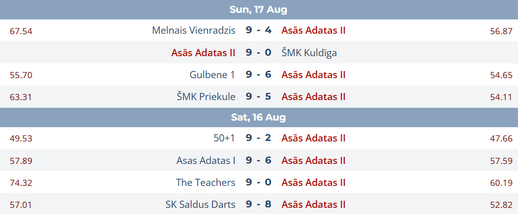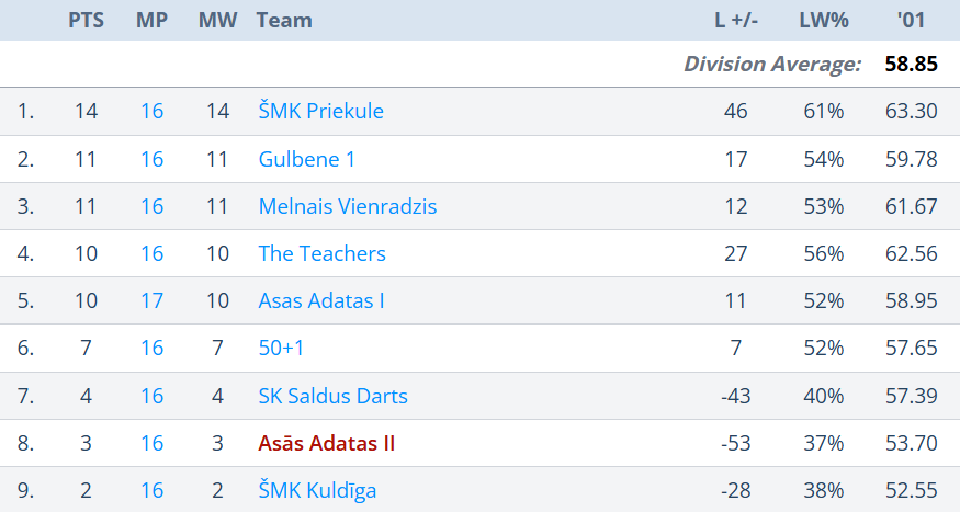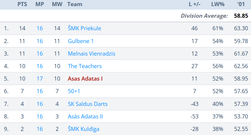 Sestdienas spēlēs mūsu puiši cīnās, cik jaudas, tomēr tiek piedzīvoti zaudējumi. Sāpīgākais no tiem pret “SK Saldus Darts”, kur spēles liktenis noskaidrojās tikai izšķirošajā legā. Tajā Edgars Barbejs piekāpās Latvijas vadošajam šautriņu metējam Madaram Razmam. Lai arī svētdien no aizvadītajām spēlēm mūsu puišiem tikusi vien pieredzes bagāža (viena tehniskā uzvara, spēlei nenotiekot), nevar neuzteikt cīņas sparu! Neviens legs netika atdots bez cīņas, un neviens pretinieks nepiegāja spēlei pret mūsējiem ar vieglu roku. Dalība Baltijas kausā un Latvijas komandu čempionāta finālturnīrā nopelnīta! Vēlam veiksmi!