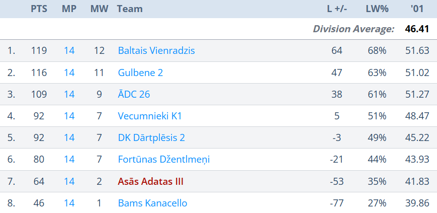 Pēc pirmā sabraukuma mūsu puišu komanda bija pirmajā vietā, pateicoties labākai legu statistikai. Otrais sabraukums gan neizvērtās ne tuvu tik veiksmīgs. Sestdien uzvaras divās no četrām spēlēm vēl ļāva cerēt uz augstu rezultātu sezonas noslēgumā. Bet svētdiena gan neko pozitīvu nenesa. Ar divām uzvarām (viena no tām piešķirta kā tehniskā) jāsamierinās ar piekto vietu kopvērtējuma tabulā, jo priekšā esošajai “The Teachers” komandai labāka legu attiecība. Mūsu puišiem jāspēlē pārspēle par palikšanu 1. līgā pret komandu “DK Dārtplēsis”. Lai gan spēles sākumā mūsējiem 2:1 vadība, tomēr spēles vidū nerealizētie dubultie ļāva pretiniekiem tikt pie 4 legu izrāviena, kas izrādījās liktenīgs. Mūsu puiši nespēja lauzt spēles gaitu un piedzīvoja zaudējumu. Līdz ar to nākamgad jāstartē 2. līgā un jācīnās par atgriešanos augstākajā līgā. Baltijas kauss un komandu turnīra finālturnīrs gan neiet secen. Novēlam tur parādīt, ka šī nedēļas nogale bija nejaušība nevis likumsakarība!