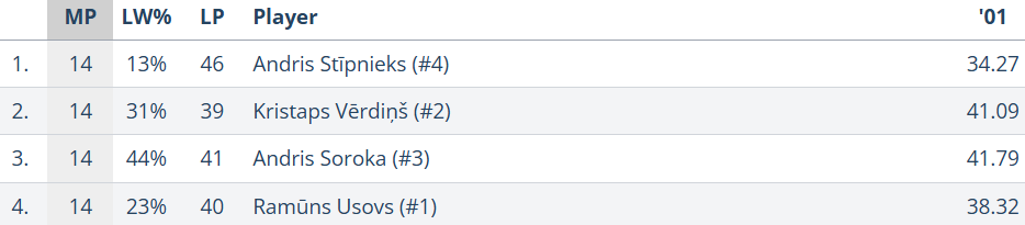 Mūsu kluba spēlētājs Andris “40A” Soroka abos sabraukumos pārstāvēja komandu “Bams 50% atlaide”. Andrim pa abiem sabraukumiem kopumā aizvadīts 41 legs, un 44% gadījumu arī izcīnīti panākumi, šajā rādītājā esot komandas līderim! Noteikti gaidām Andra dalību kādā no mūsu pašu komandām nākamajā gadā!