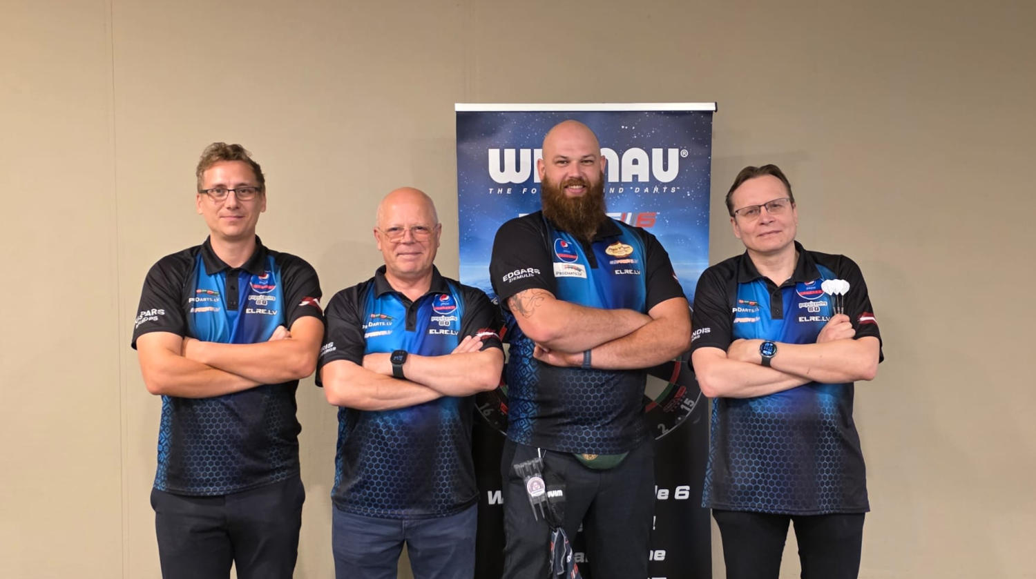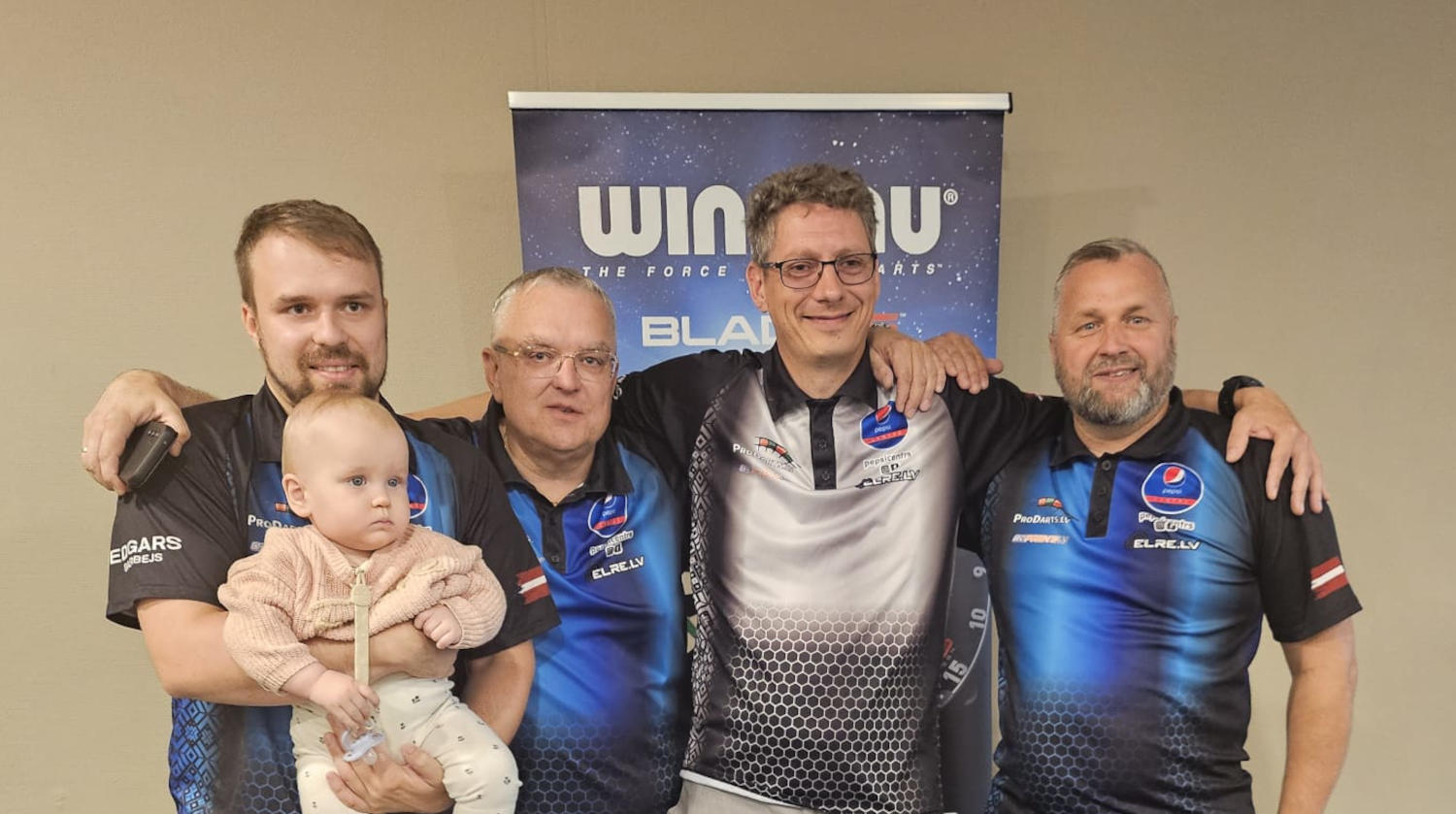 Asās Adatas II pārstāvēja Rolands “Gaross” Garonskis, Ainārs “Hot Dart” Barbejs, Edgars “Edža” Barbejs un Raimonds “Slangevar” Stumburs. Foto ar vienu no jaunākajiem komandas atbalstītājiem.