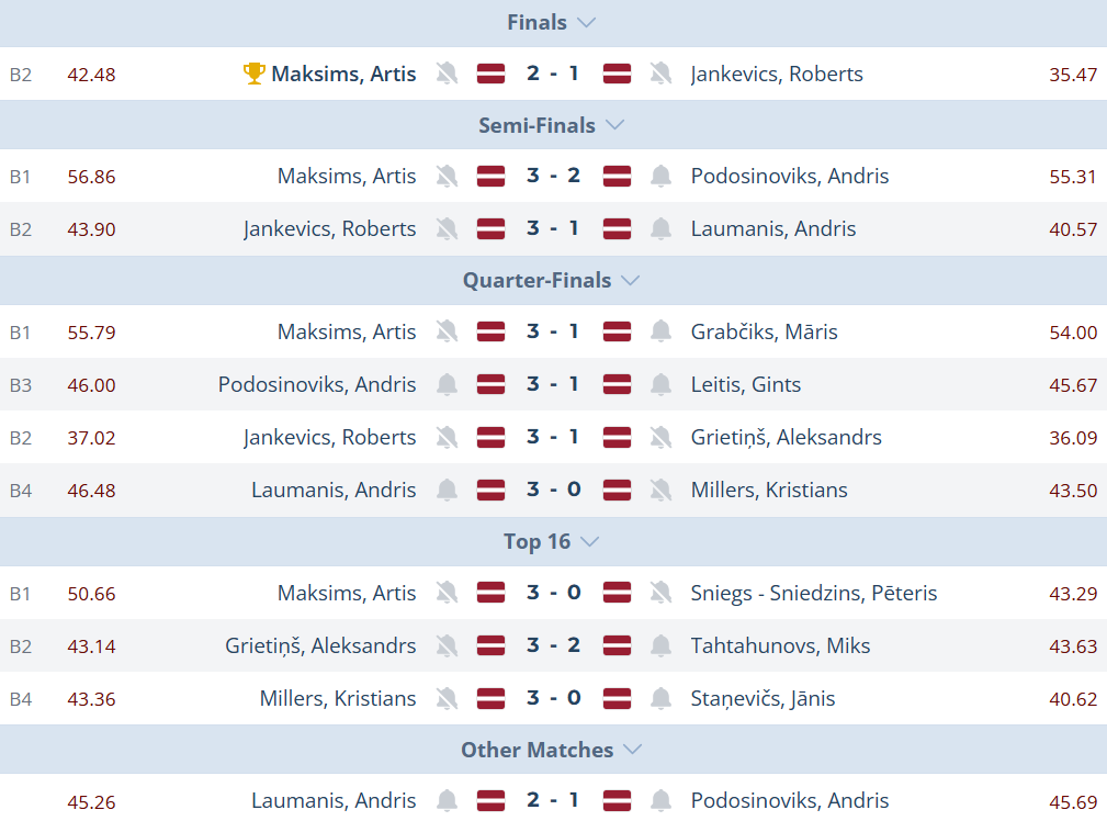 Artis Maksims (42,48) 2:1 Roberts Jankevics (35,47)