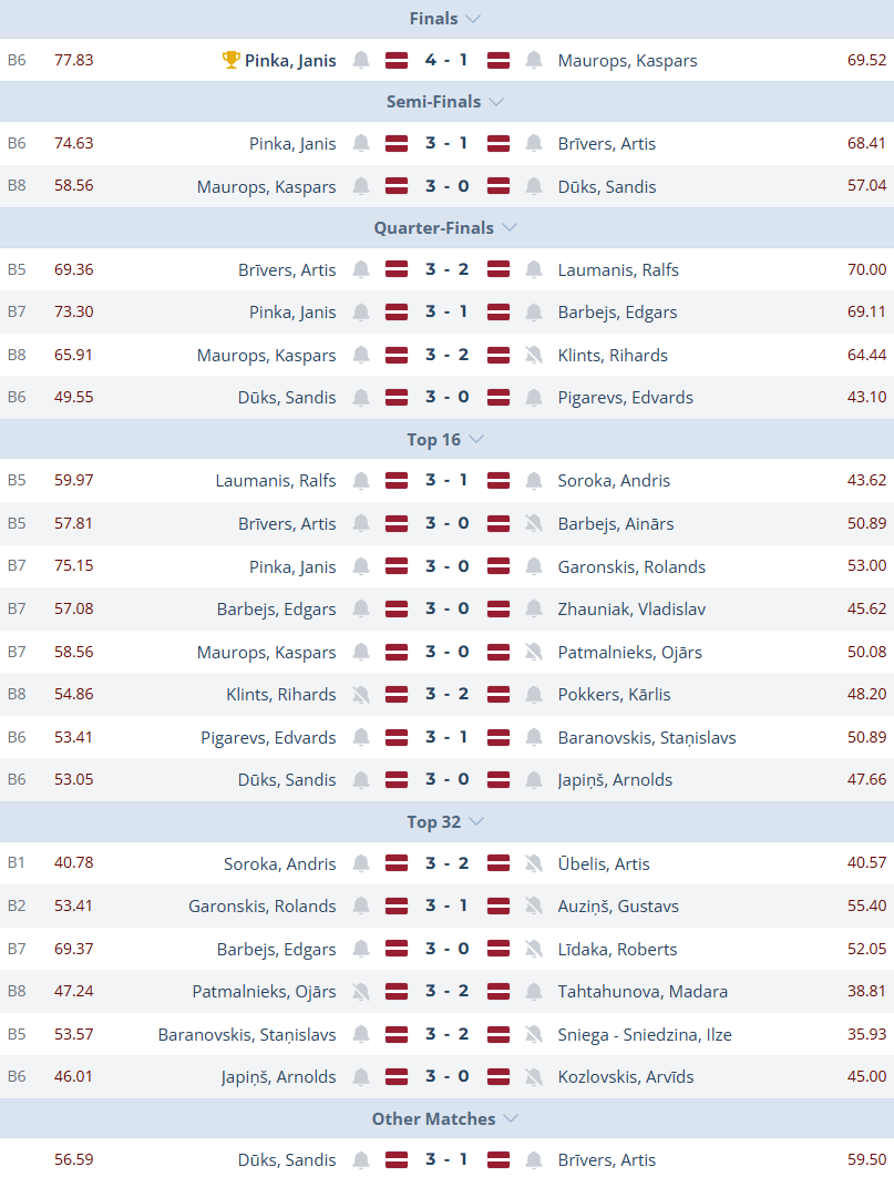 Jānis Pinka (77,83) 4:1 Kaspars Maurops (69,52)
