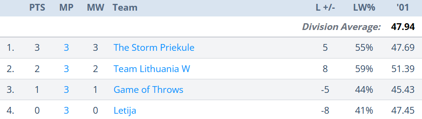 Turnīra izloze nav lutinājusi,- mūsu dāmu pārstāvētā komanda trāpījusies pārliecinoši spēcīgākajā kompānijā. Lai gan neviens legs netiek atdots bez cīņas un visas spēles aizvadītas ar diezgan ciešiem rezultātiem, tomēr trīs grupu spēlēs pie panākumiem tikt neizdodas.