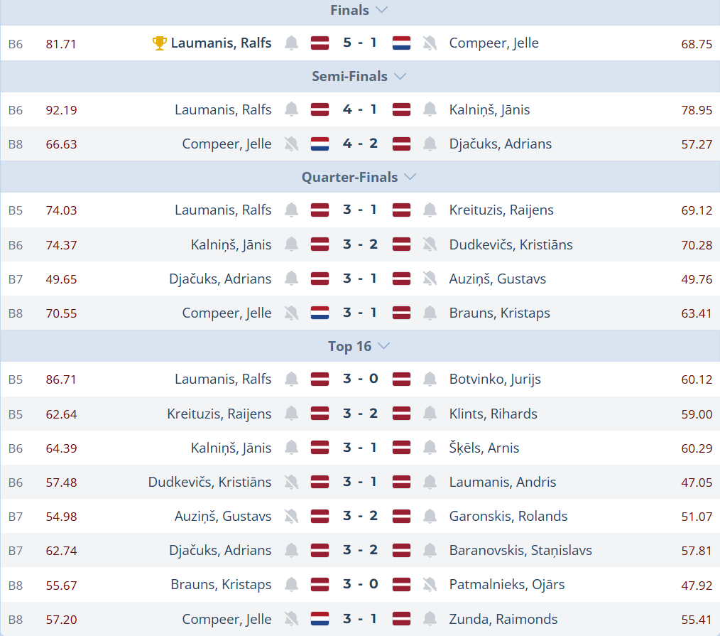 Ralfs Laumanis (81,71) 5:1 Jelle Compeer (68,75)