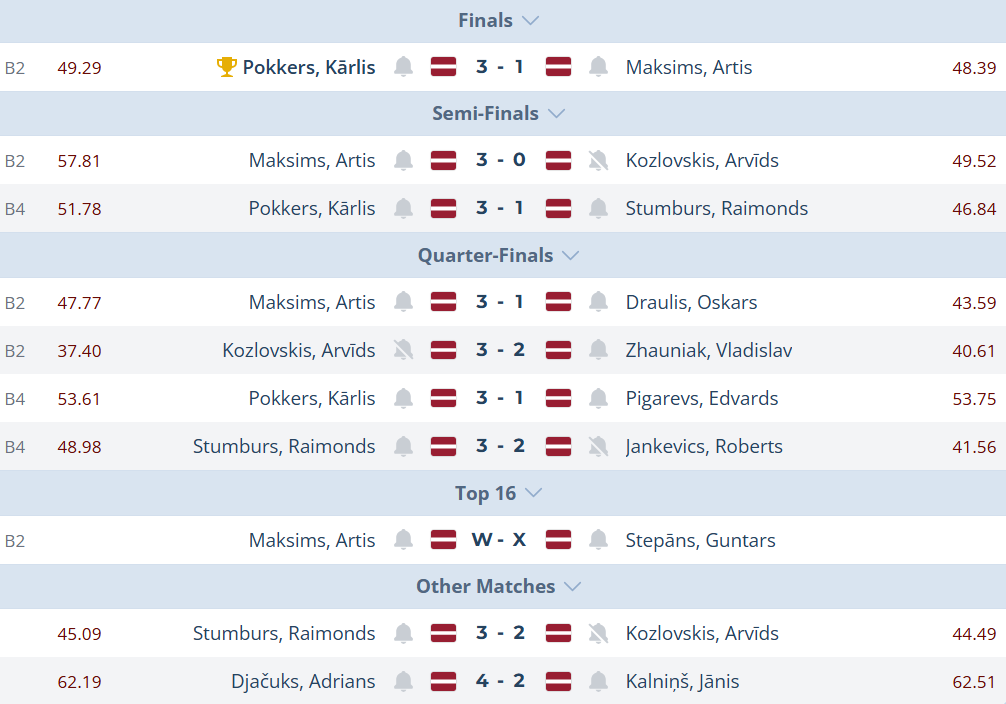 Artis Maksims (57,81) 3:0 Arvīds Kozlovskis (49,52)