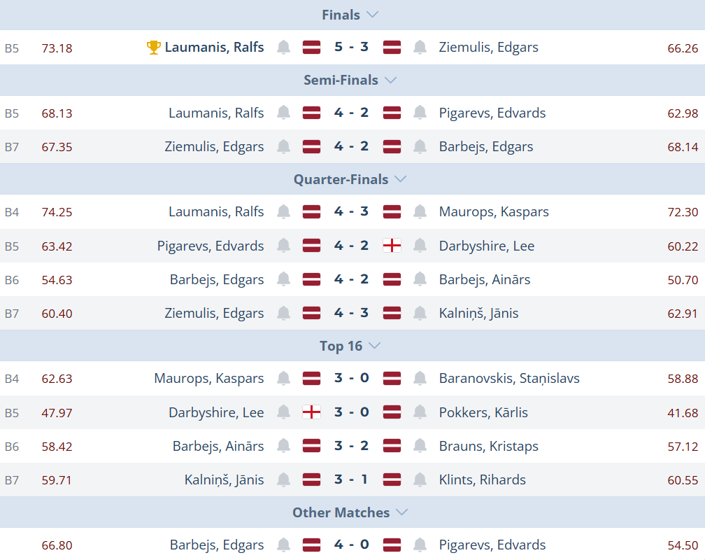 Edgars Ziemulis (67,35) 4:2 Edgars Barbejs (68,14)