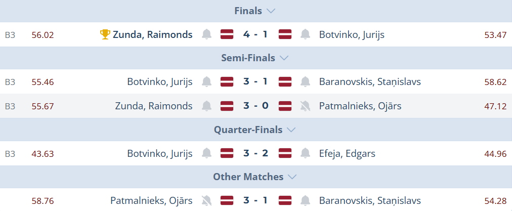 Raimonds Zunda (56,02) 4:1 Jurijs Botvinko (53,47)