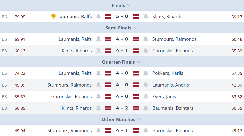 Ralfs Laumanis (69,91) 4:0 Raimonds Stumburs (60,46)