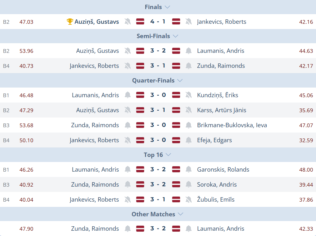 Gluži kā savā pusfināla spēlē Andris tiek pie 2:0 vadības, Raimondam mokoties ar dubultajiem. Tam seko divi legi, kuros jau pārliecinošāks Raimonds, panākot izlīdzinājumu spēlē. Izšķirošajā legā Andrim neiet ar summām un 140 punktu gājiens nāk par vēlu. Raimonds pamanās noslēgt 42 punktus un tikt pie bronzas godiem!