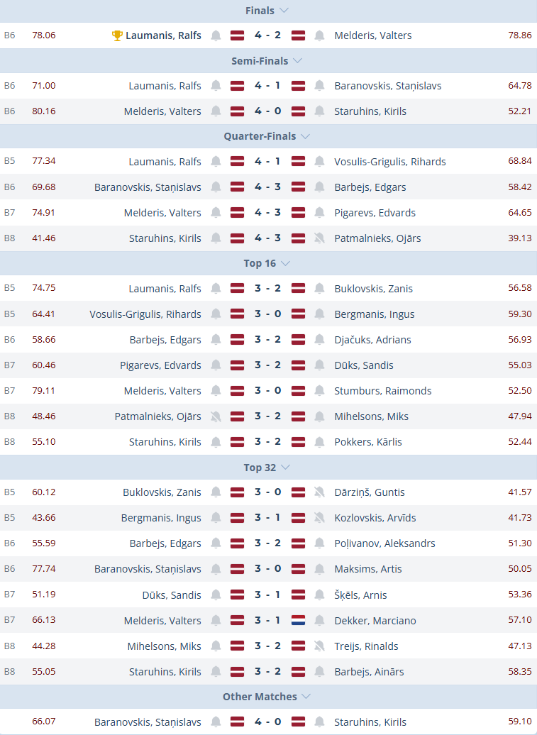 Pirmais legs diezgan droši Staņislava kontā. Otrajā legā Kirils jau demonstrē kvalitatīvāku spēli, taču 33 punktu noslēgumam nav lemts krist. Tad Staņislavs vēlreiz pārliecinoši uzvar paša sākto legu un jau panāk 3:0. Kirils vēl tiek pie reālas iespējas ieķerties mačā, bet ar pāris šautriņām pa dubultajiem viņam diemžēl nav gana. Uz pjedestāla, triecot šautriņu D20 segmentā, tiek Staņislavs!