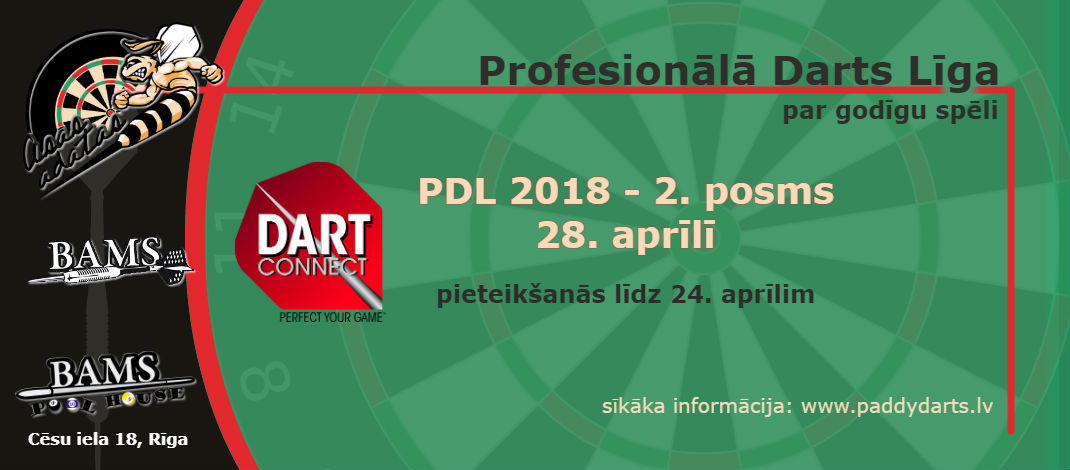 28. aprīlī biljarda kluba BAMS telpās tika aizvadīts Profesionālās Darts Līgas otrais posms, kurā piedalījās 11 dalībnieki. Turnīra pirmo vietu izcīnīja Kristaps Mickus, kurš trijās Lasīt vairāk